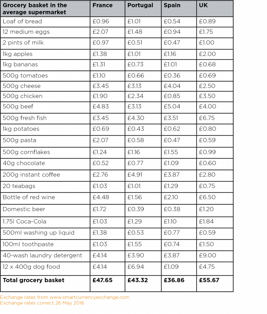 In the PropertyGuides.com annual Cost of Living survey, expats in France, Spain and Portugal compare the price of an average basket of groceries between their country and the UK.